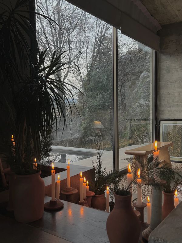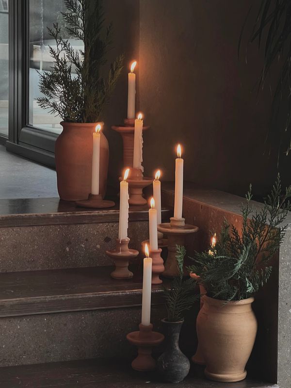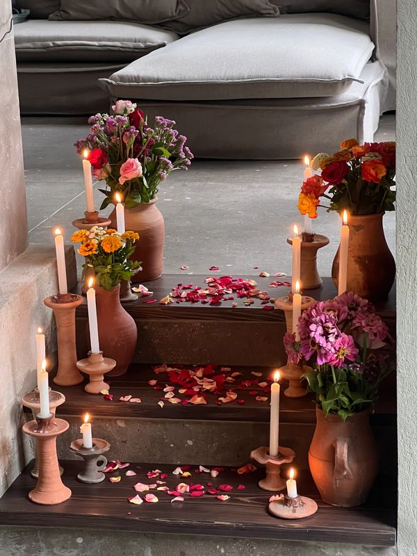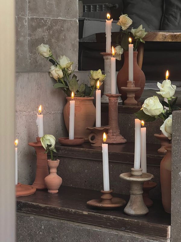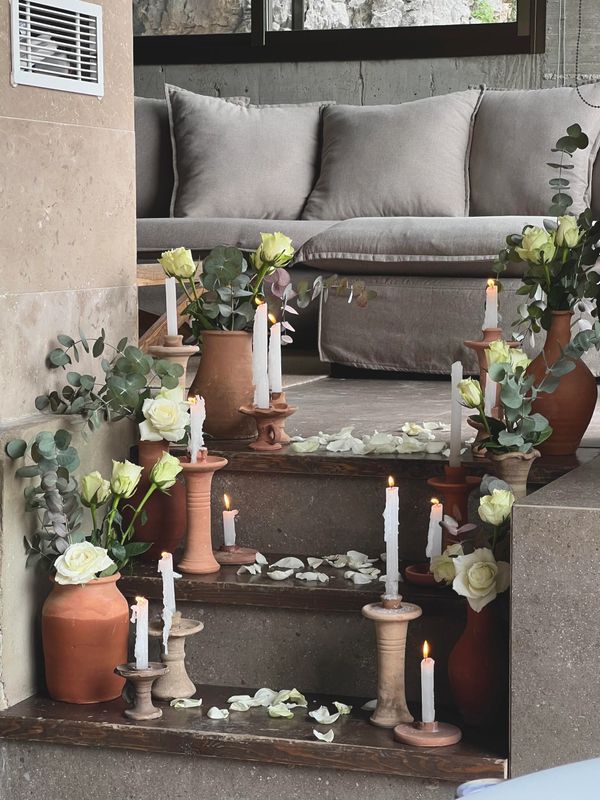 An earthy celebration package featuring rustic vintage clay-orange vases and candle holders, adorned with 24 white candles.