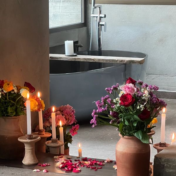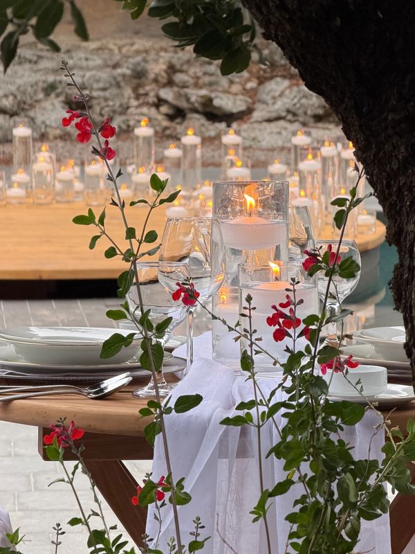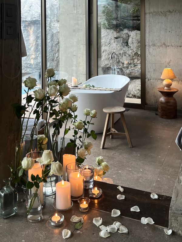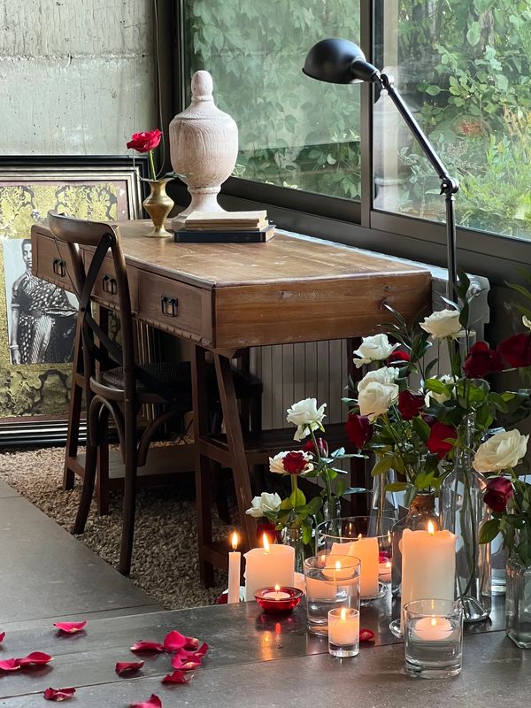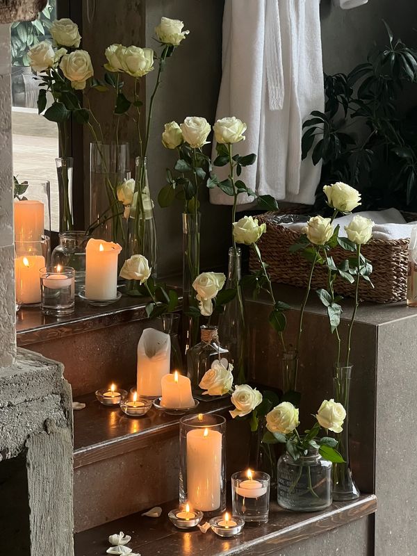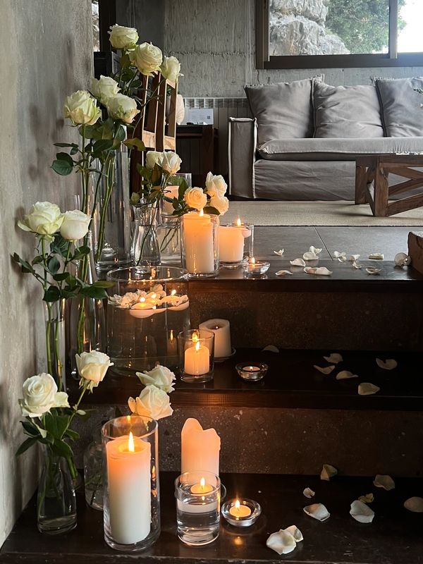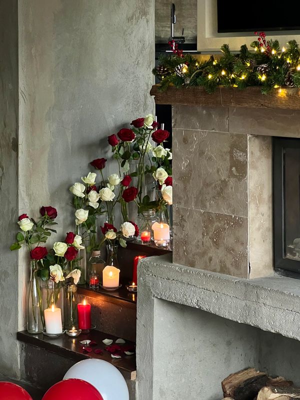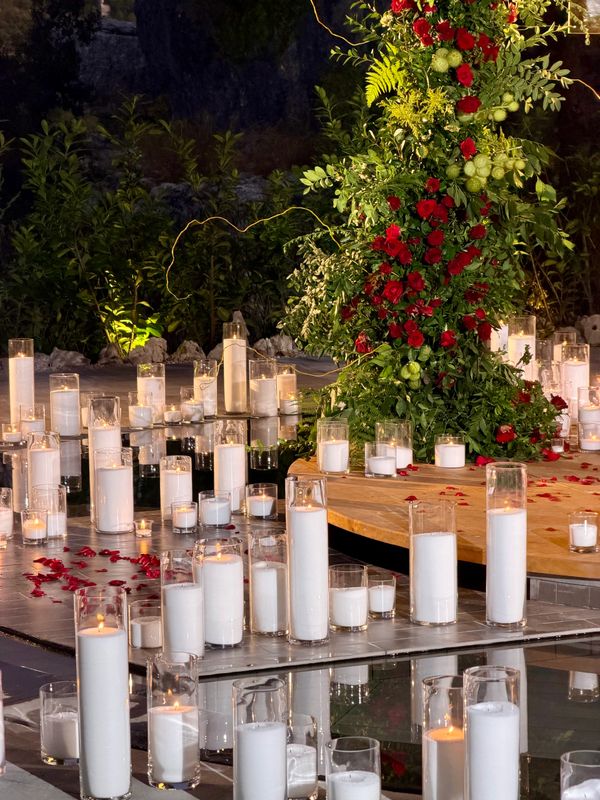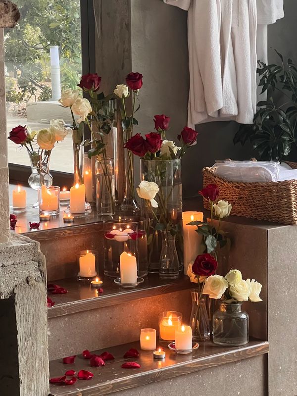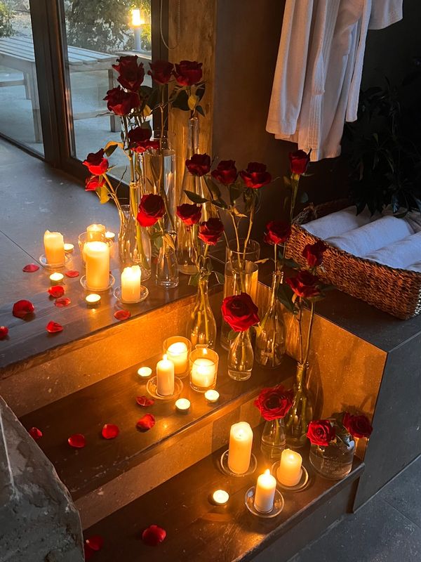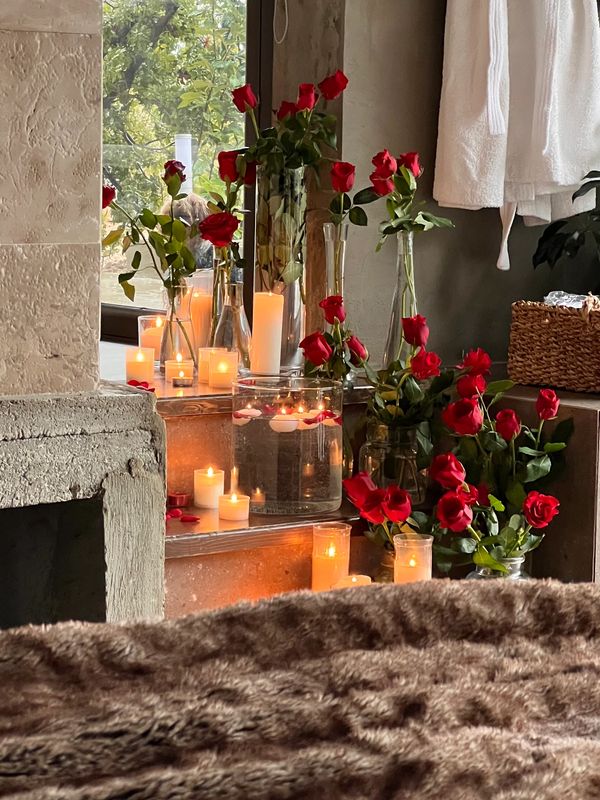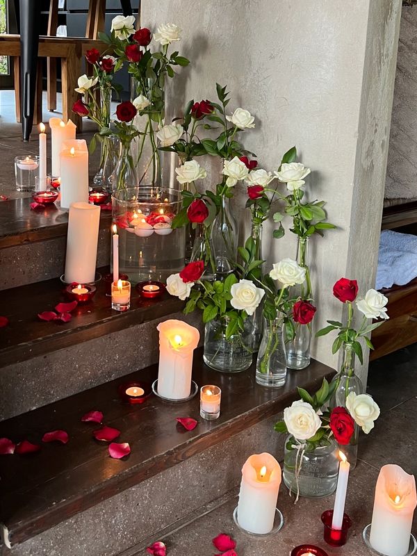 An enchanting arrangement of 45 roses red, white, red and white, or any color of your choice in elegant glass vases, complemented by over 20 candles and scattered rose petals to create a romantic atmosphere.