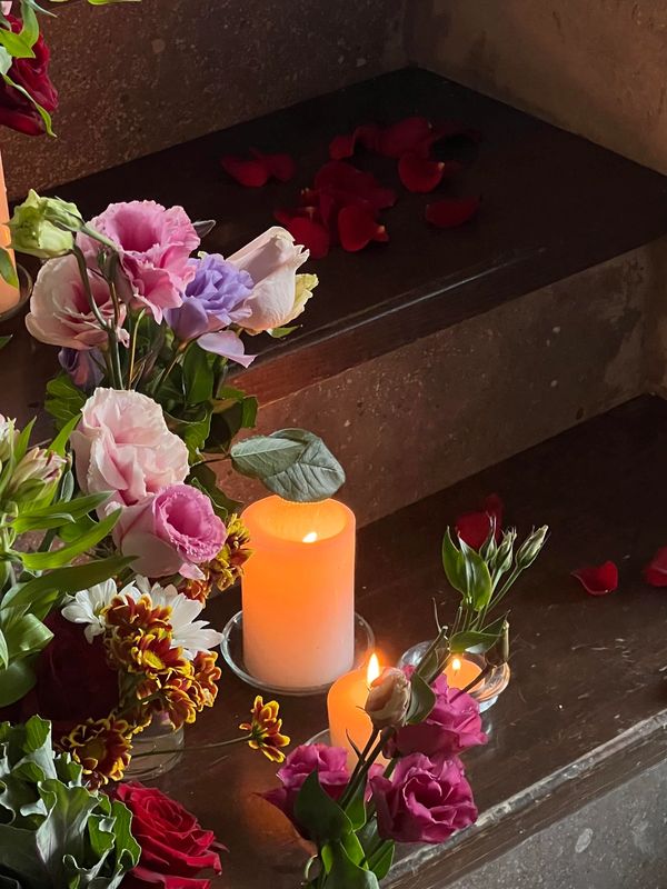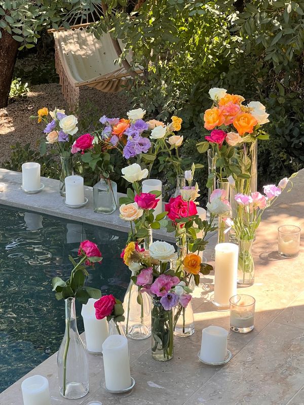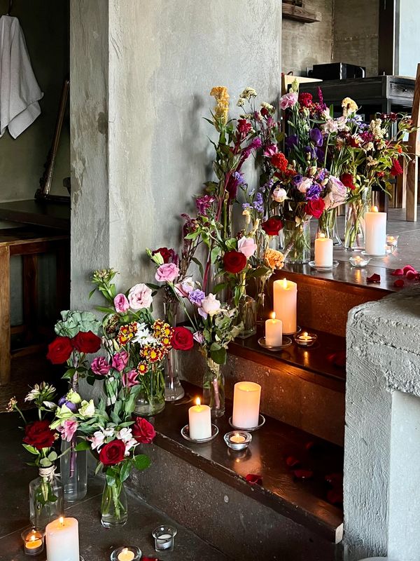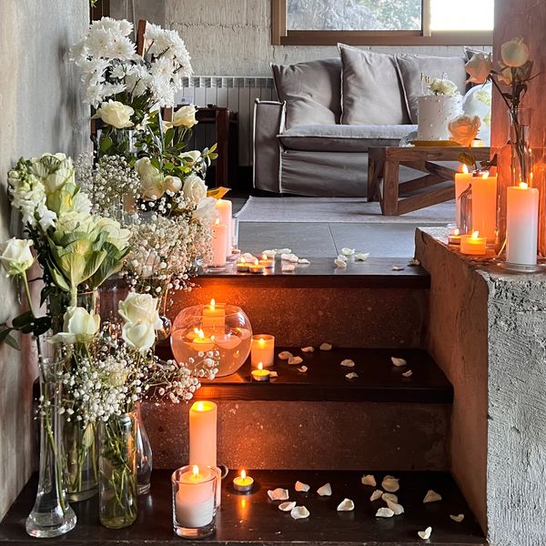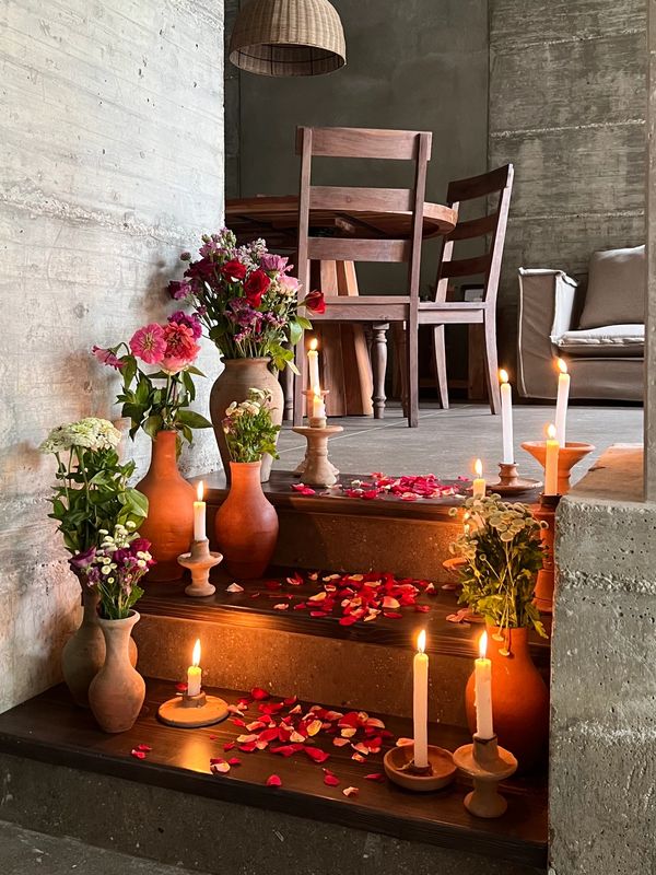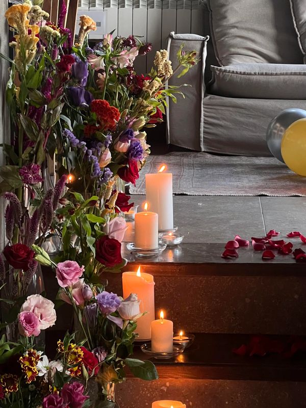 Experience a burst of color with our Colorful Blooms package, featuring stunning arrangements of approximately 70 multicolored roses and flowers in glass vases on both sides of the stairs. Accented with over 20 candles of varying sizes, scattered petals, and colorful balloons, this setup creates a lively and festive atmosphere.
