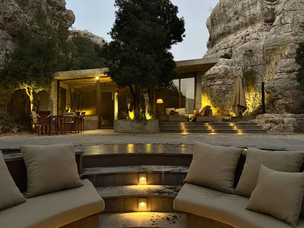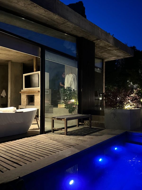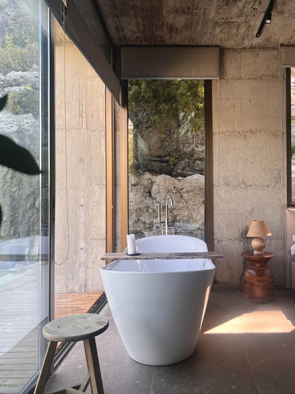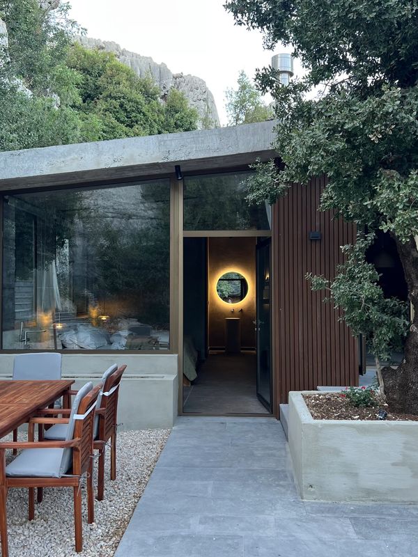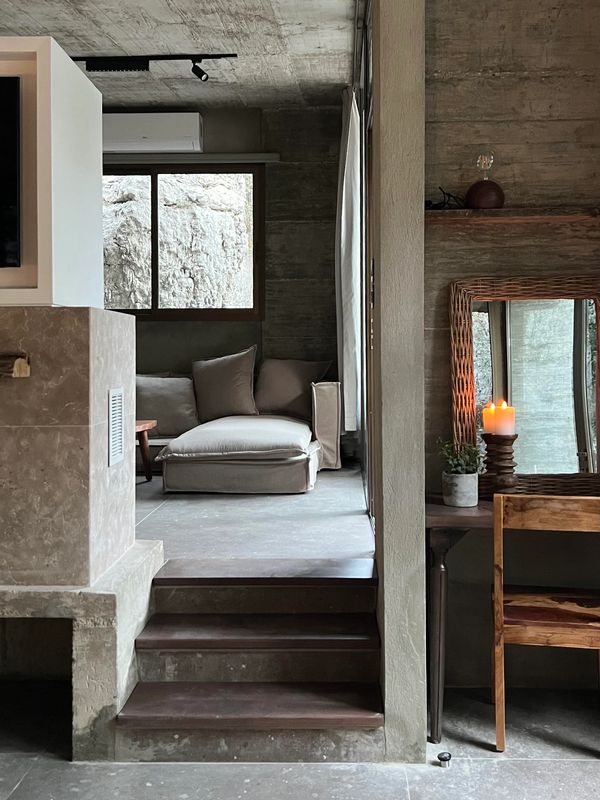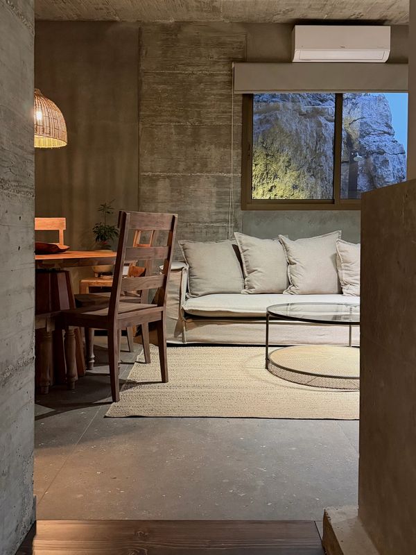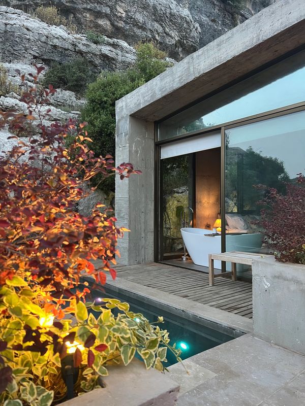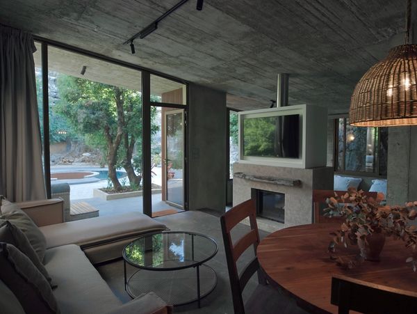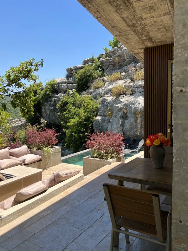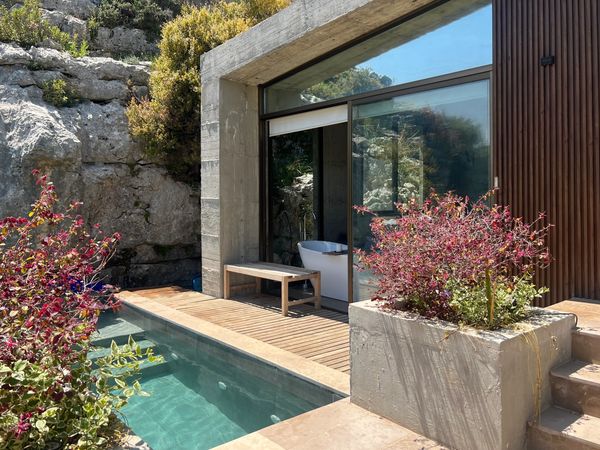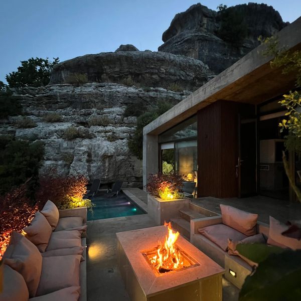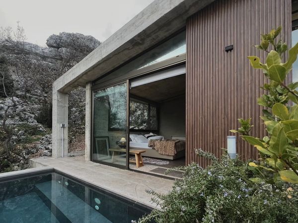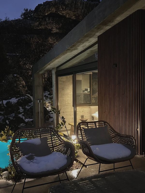 Tucked among majestic rock formations with sweeping mountain views, The Serenity Villa is a thoughtfully designed concrete hideaway. Perfect for couples yet comfortable for up to four guests, it features a spacious 200 m² outdoor patio with a striking round pool offering a peaceful and unforgettable nature escape. Its unique setting also makes it ideal for intimate outdoor private events.